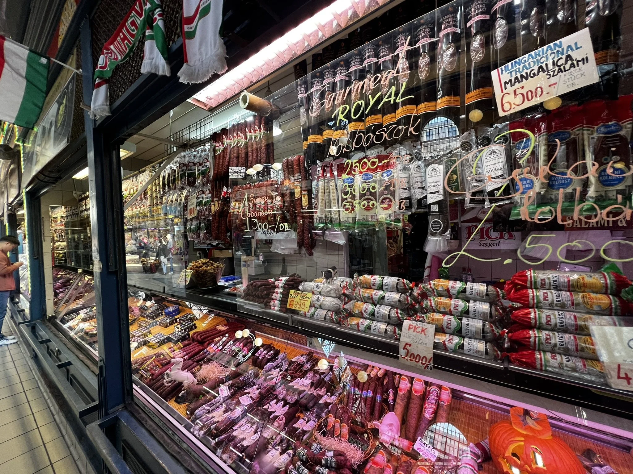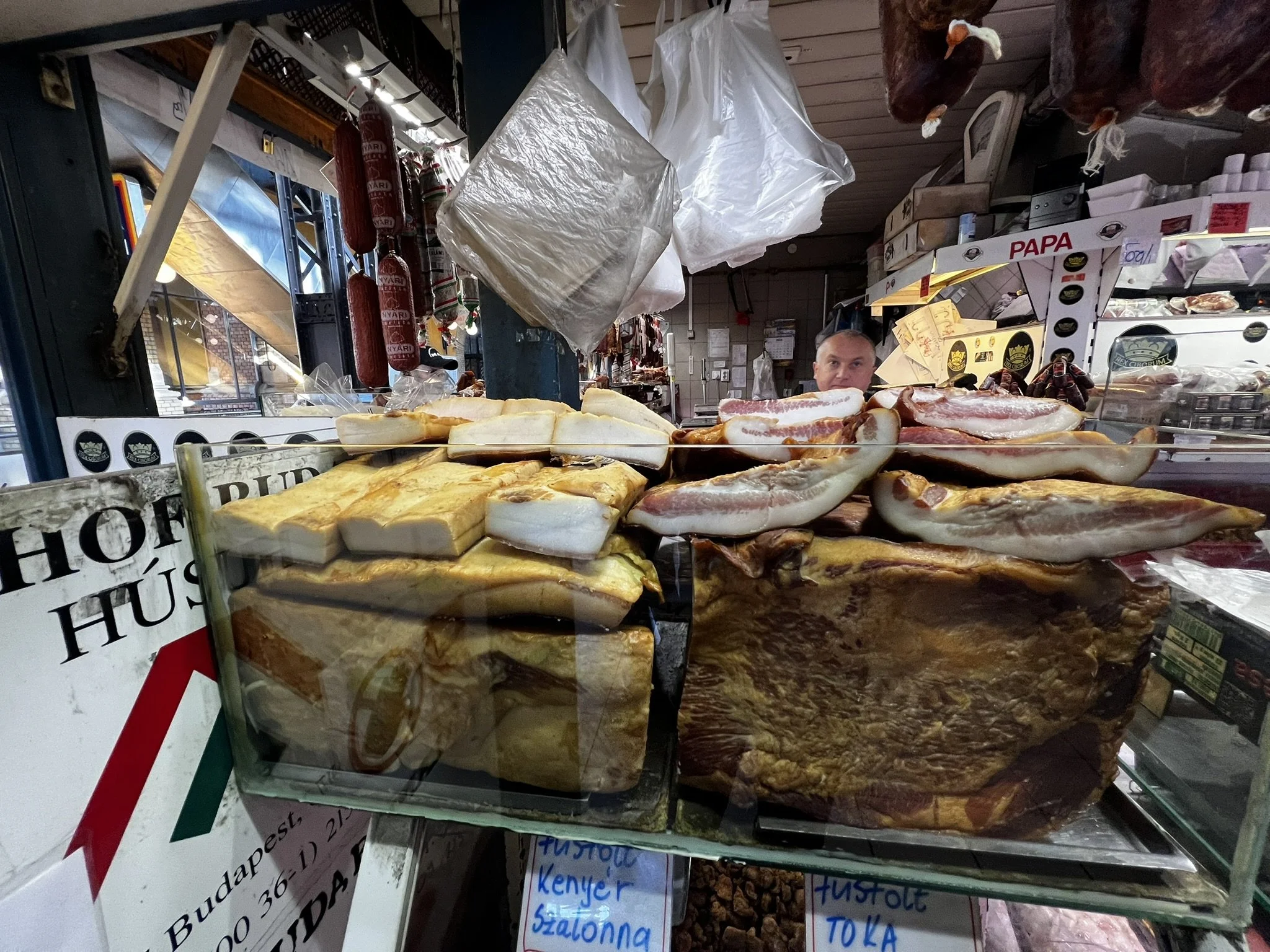 Inside, the lower floor buzzed with eager shoppers squeezing and sampling stacks of fresh produce that spilled from a myriad of enticing stalls—shiny apples, pickled gherkins, red, green, and purple tinted cabbage, candies, a plethora of stomach churning spirits offered by grinning locals. Smoked sausage and cured meats hung like trophies alongside barrels of fiery red paprika waiting to stain your fingers.