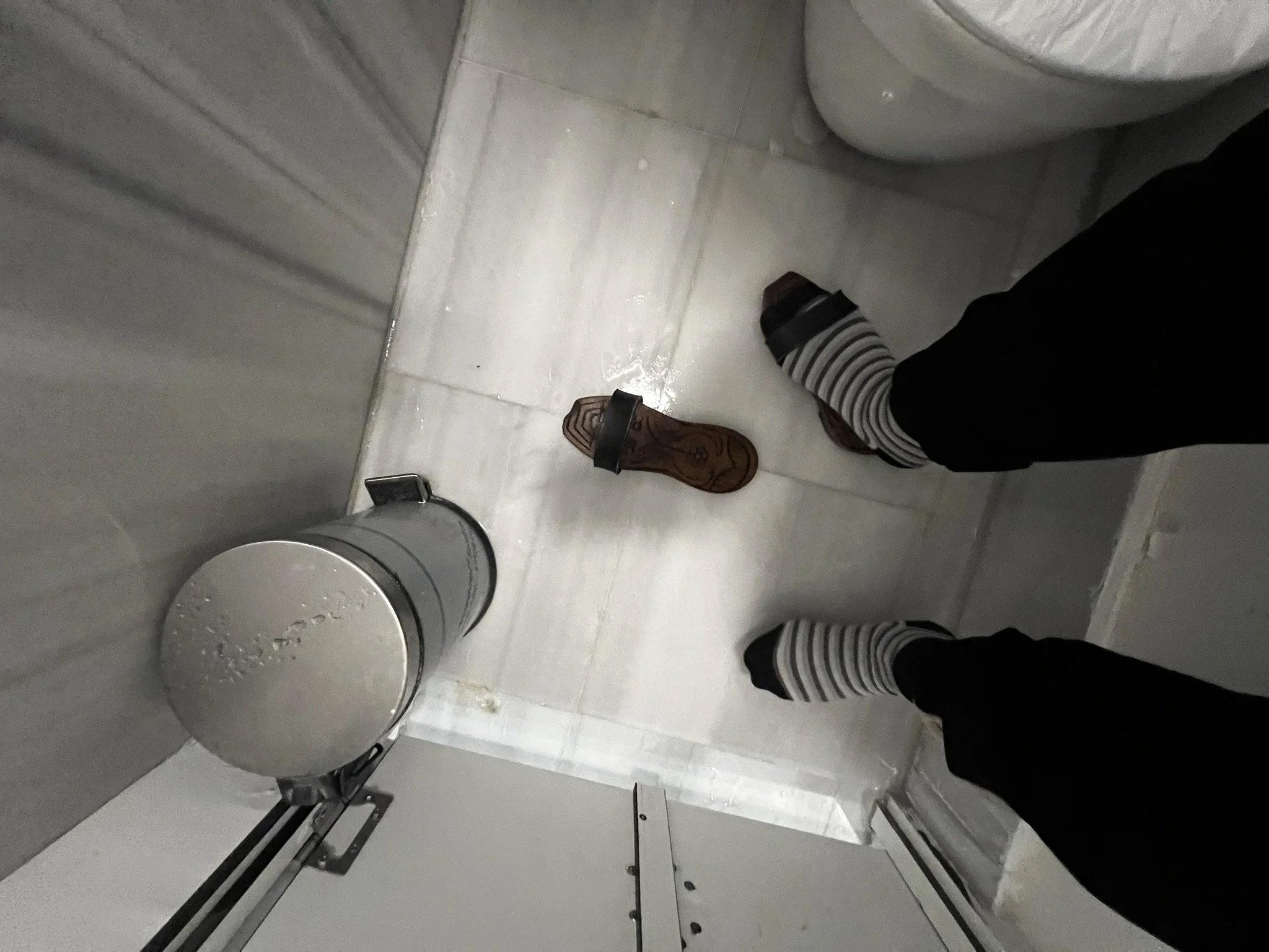 I found one behind a set of saloon doors but had to don wooden, curling-toed Aladdin slippers. The floor was slick with water—some kind of communal hammam? I didn’t ask. I slipped them on, took a picture of myself in the cubicle (I had to), then went outside and observed the ceremony from a bench until the Istanbul chill sent me home.